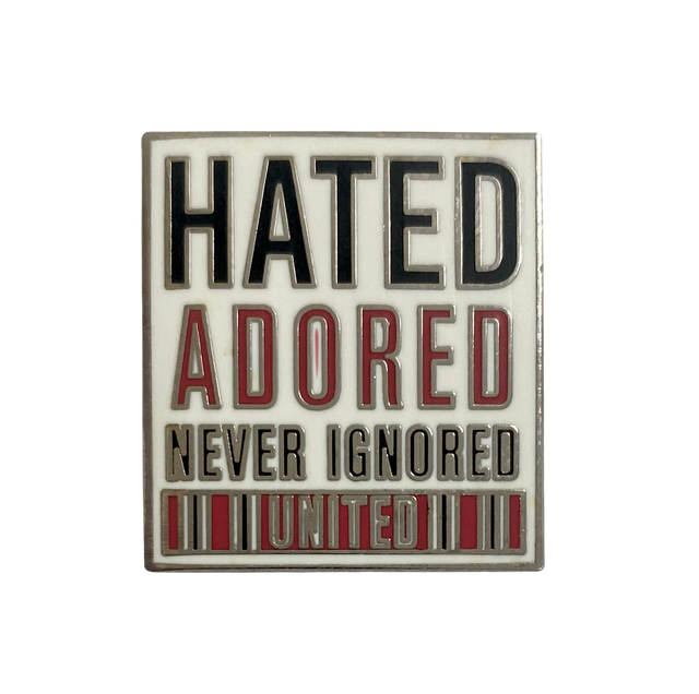 A badge featuring Hated Adored Never Ignored badge.
