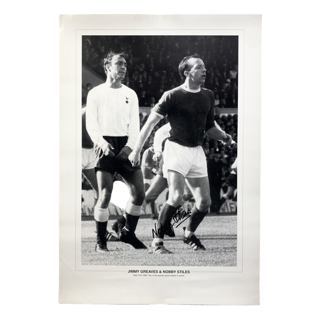 A striking photograph capturing two legendary figures from England's 1966 World Cup triumph. This authentic print features Jimmy Greaves and Nobby Stiles during their playing days, commemorating one of football's most iconic eras. Signed by Stiles himself, this piece carries genuine historical significance for collectors and enthusiasts. The image preserves a moment of sporting greatness, showcasing two players who defined an unforgettable chapter in English football history. Perfect for displaying in any football memorabilia collection or as a tribute to the golden age of the beautiful game.