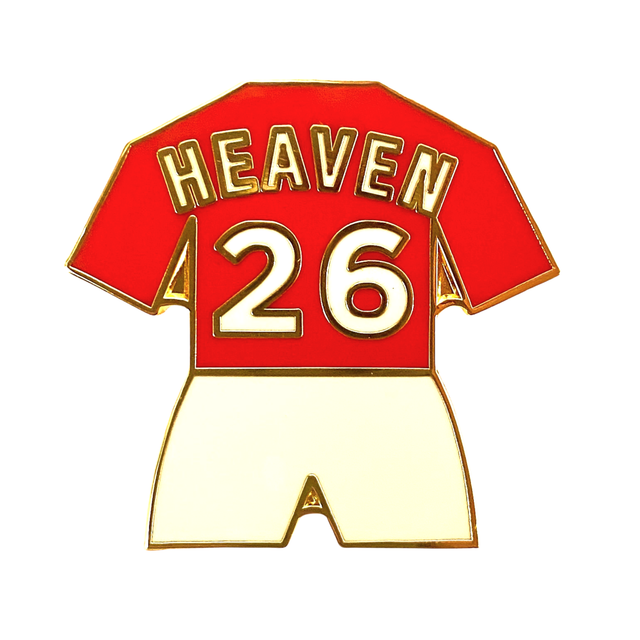 A metal badge of Ayden Heaven in a shape of a football kit.