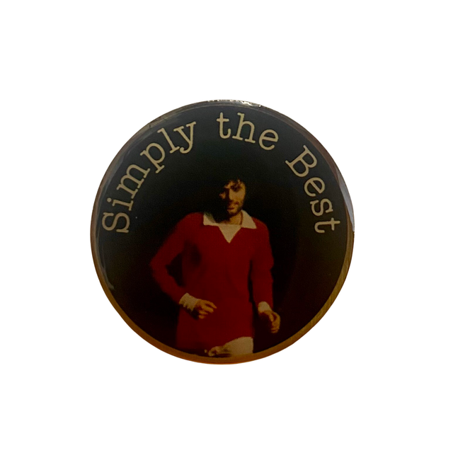 This is black enamel badge (1" or about 2.4 cm) with the words SIMPLY THE BEST arced over the picture of George and based on a design that was used to promote the "SIXTY OF THE BEST" event to celebrate what would have been his 60th birthday. The clasp is a very solid safety-pin style. All profits from this pin will go to the George Best Foundation.