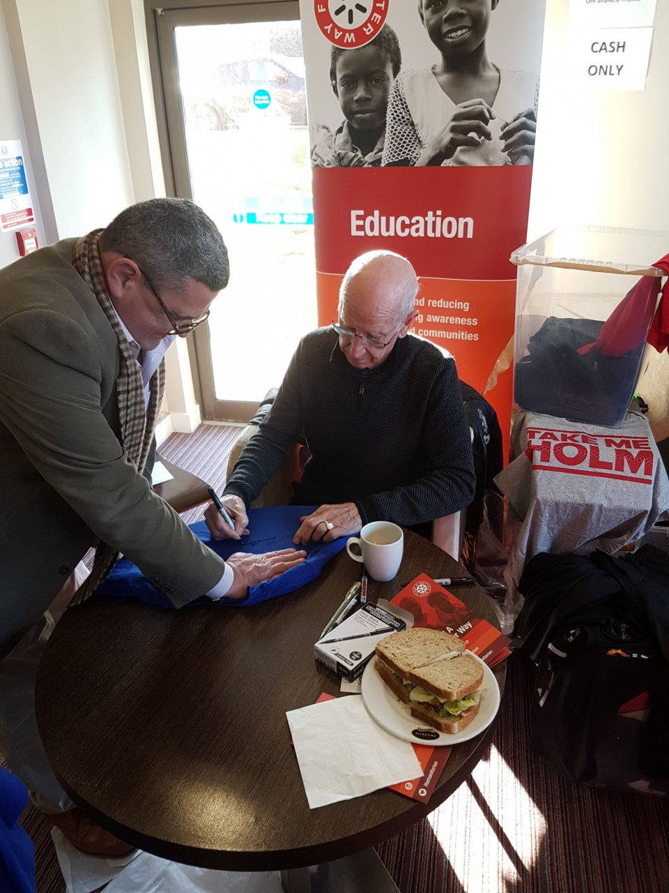 A true United club legend - Busby Babe, Munich survivor, European Cup Winner, World Cup Winner, European Player of Year ...... The signing with Sir Bobby Charlton took place in November 2017 in Knutsford raising funds for his charity Find A Better Way. The autograph is on a replica of the iconic 1968 Blue European Cup Final Shirt.