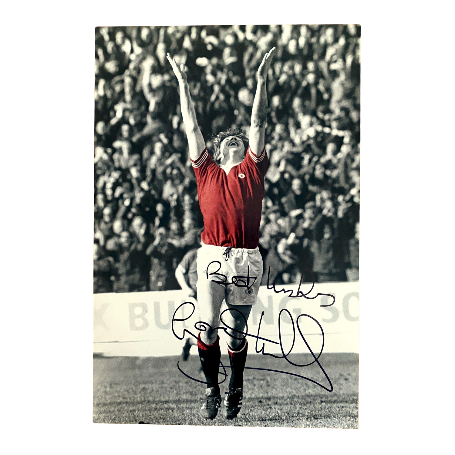 Capturing Hill during his playing days, this image pays tribute to his influential contributions to the club in the 1970s. The authentic signature adds a special personal touch, making it a prized piece for supporters and collectors alike.