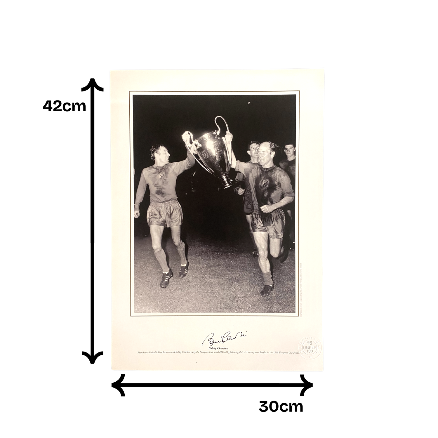 A legendary moment in football history with this large photo print of the 1968 European Cup Final, signed by Sir Bobby Charlton.